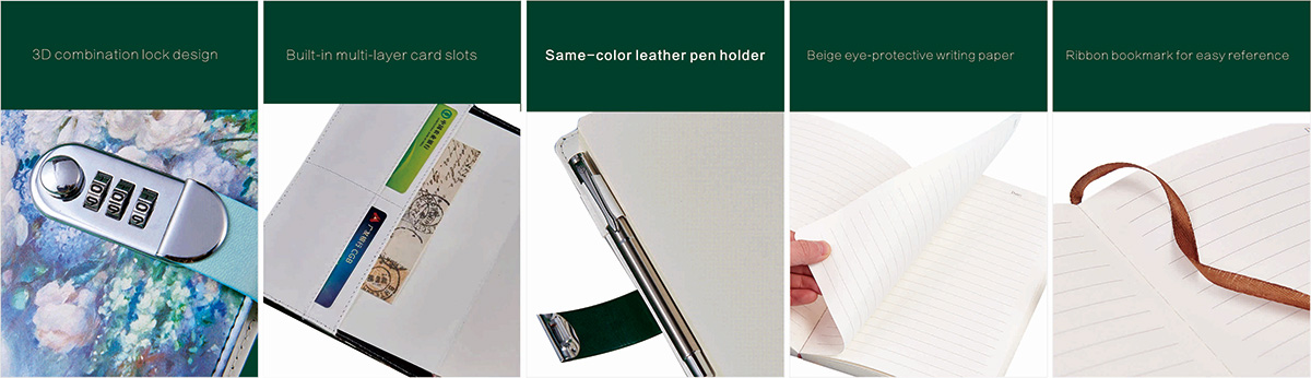 এই লকিং ডায়েরির কভার ডিজাইনটি একটি বিশিষ্ট বৈশিষ্ট্য এবং এতে একটি অনন্য শৈল্পিক কবজ রয়েছে। আমরা বিভিন্ন ধরণের নিদর্শন সরবরাহ করি, বিভিন্ন শৈল্পিক শৈলীর আচ্ছাদন করে। এই ডিজাইনগুলি কেবল সুন্দরই নয়, তবে দুর্দান্ত পরিধানের প্রতিরোধ এবং জলরোধী বৈশিষ্ট্যও রয়েছে যা আপনার ডায়েরিটি আরও ভালভাবে রক্ষা করতে পারে এবং দীর্ঘ সময়ের জন্য আপনার সাথে যেতে পারে।